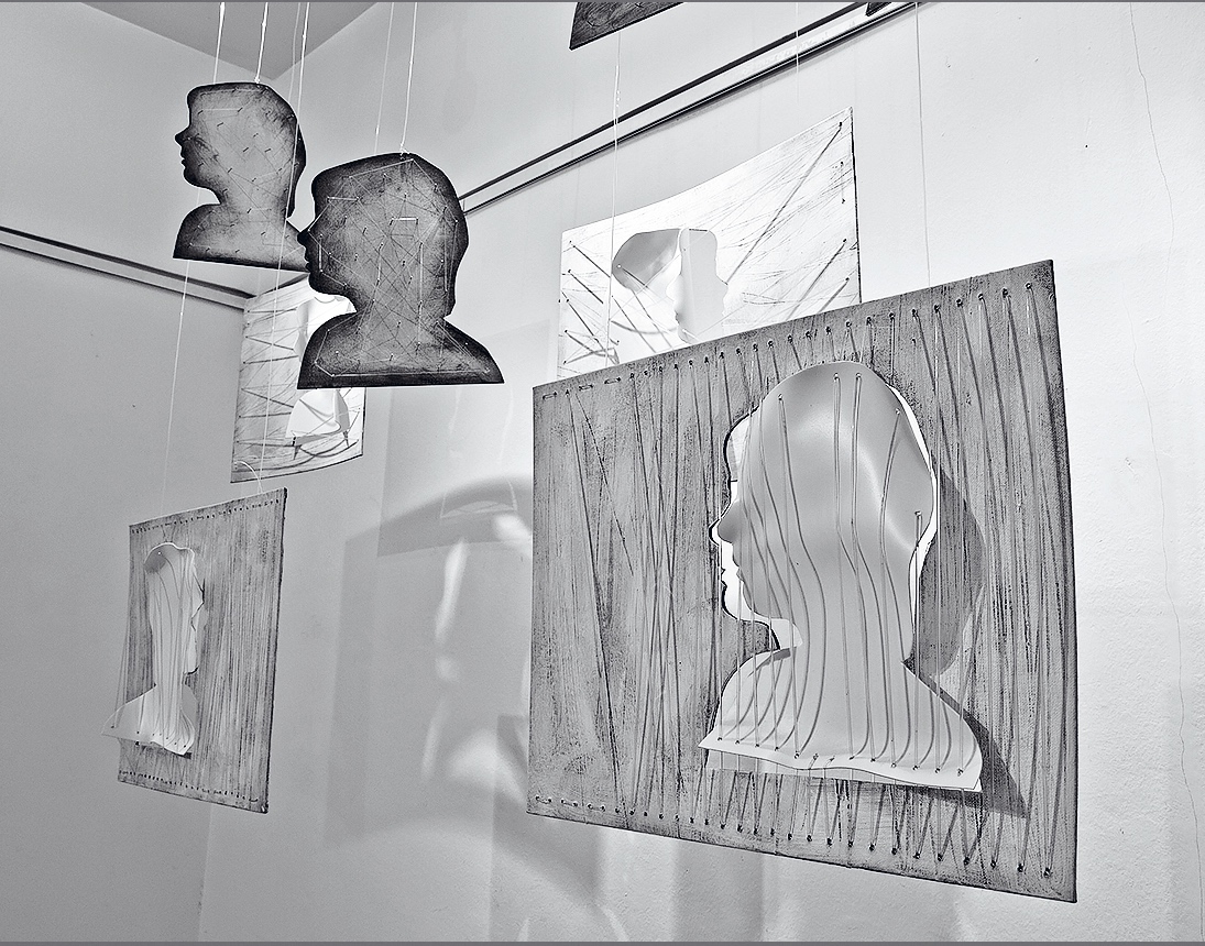 On the relation man-space-time, represented by the enigmatic symbolism of white and black, formal characteristic and the suggested three dimensionality, each of the exhibited works emits its own statement, staticity and formality, but also her own position of free play and different interpretations of the observer . The absence of color announces the idea of infinity and immortality and introduces a motionless, almost metaphysical atmosphere / silence and reality. Marina Cvetanovska Martinovska in the choice of work material, remains consistent with the forex (synthetic material), because of her admissible property of sterility and elasticity intervening with perforation, sewing with a silicone thread as a symbolic process of breaking the emotion, the pain.