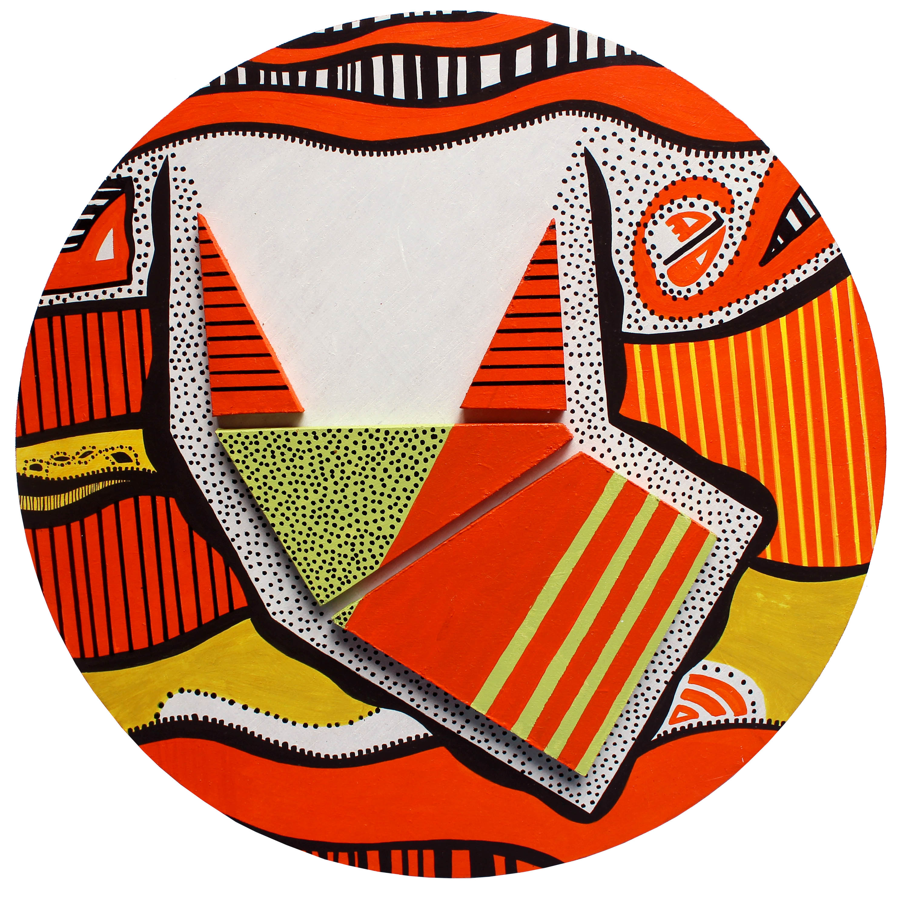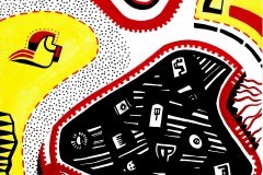 The creative works of this cycle are made in acrylic technique – small formats, symbolizing the microscopic size of the virus, which are complemented by small pieces that penetrate the surface. In the circular, square and triangular space, smooth wavy and dashed lines are drawn with steady strokes – the path along which the virus moves, while dotted segments indicate the circulation and spread of the virus. Each work uses a wide range of forms with which the author parallels the variations of the microcosm, and such a way of expression can be seen in many of her previous cycles and exhibitions. When we see the imaginary amoebic and geometric beings miraculously scattered throughout the space, we get acquainted with the rich thought and surreal fantasy of the author wanting to convey a short animated story. The concept of the works is thought out and narrative, and the space is rationally used. This is achieved through the mutual synthesis of warm and achromatic colors, a concretely composed drawing, which expresses the graphic impulse of the artist. Through the color, the form and the way of visual presentation of the works, we follow the artistic style of Zafirovska, which can be deservedly categorized as part of the modern abstract art.
